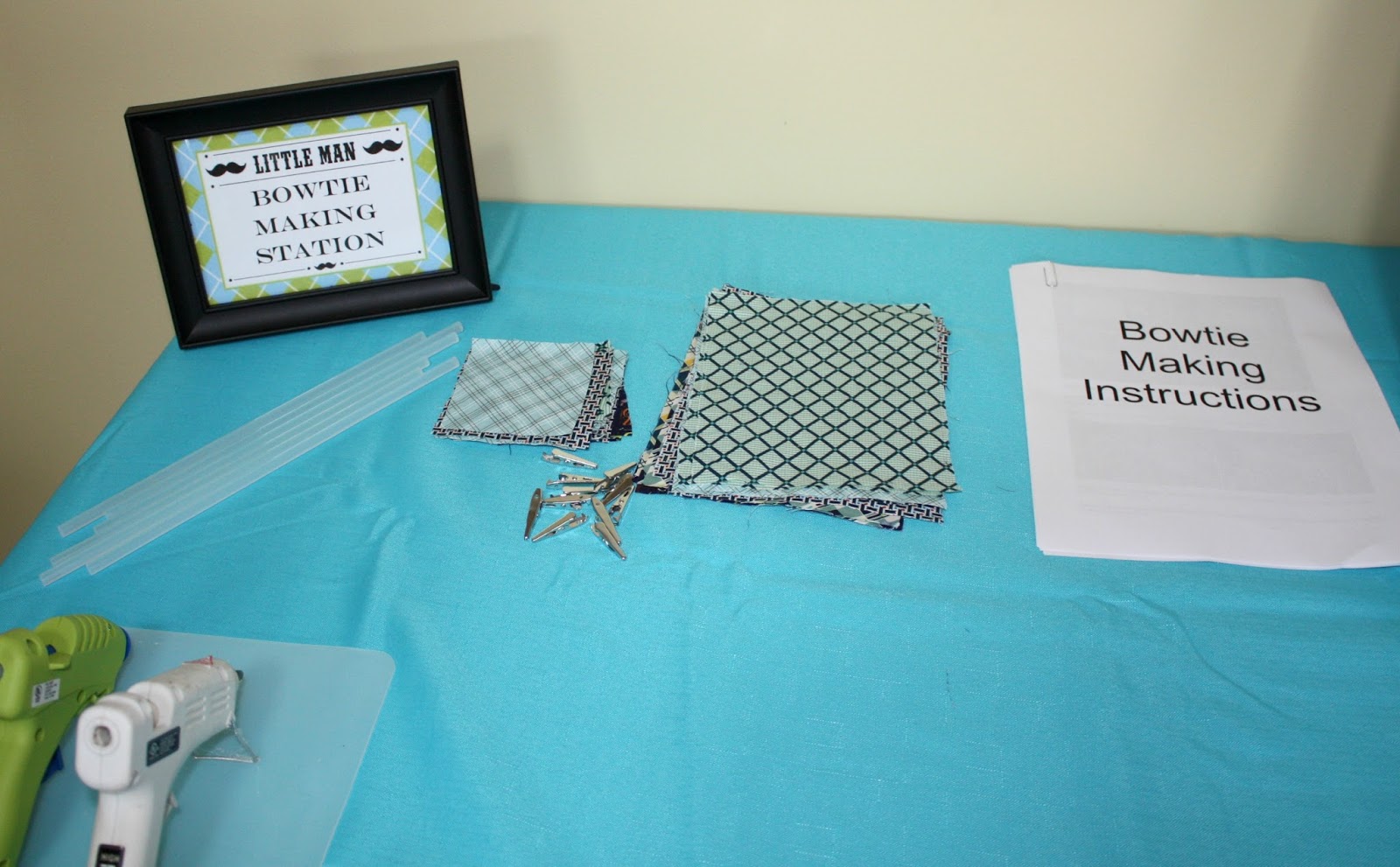 Instead of normal baby shower games I decided on activities where everyone could participate. I had two stations set-up that included a bow tie making station and a onesie making station.